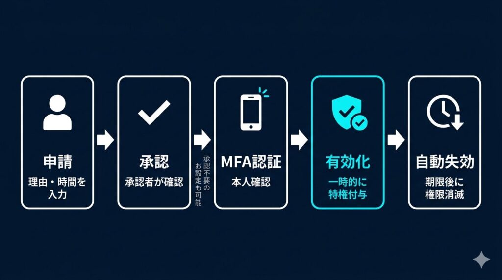 | 承認ワークフロー | 特権有効化に上長や別管理者の承認を必須にできる |