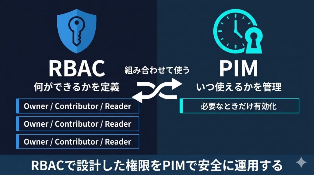 つまりRBACとPIMは競合しません。RBACで設計した権限をPIMで安全に運用する、という組み合わせです。