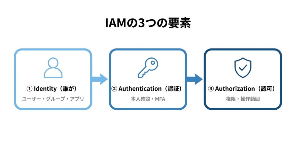 IAMはアクセス管理の全体像を扱う概念ですが、その中でも特に重要な3つの要素(Identity / Authentication / Authorization)があります。