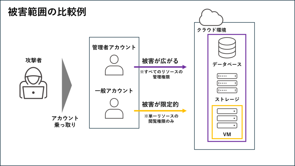 過剰権限の付与:「とりあえず管理者権限を付与する」「一時的な対応のつもりで広い権限を付けたまま」——権限が強いということは、侵害されたときの被害も最大化します。管理者権限を取得した攻撃者は、新しいアカウントの作成、セキュリティ設定の変更、データの持ち出し、リソースの削除まで可能になります。