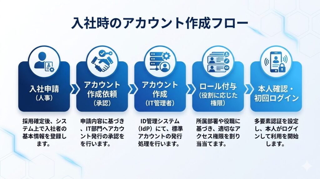 入社フローの図(申請→承認→アカウント作成→ロール付与の流れ)