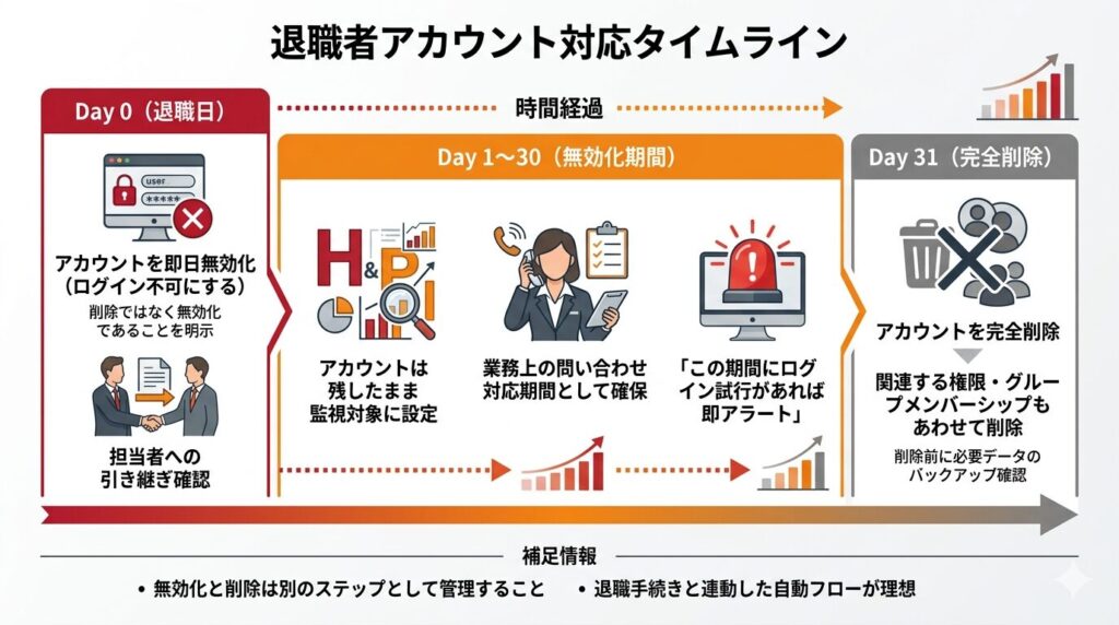 - 退職日に「即日無効化」、一定期間後に「完全削除」を行う