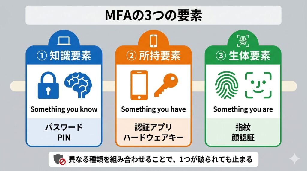 MFAは「異なる種類の要素」を組み合わせることに意味があります。同じ種類を2つ使っても(パスワード+秘密の質問など)、1つが漏れれば両方突破されるリスクがあるため、MFAとは呼びません。
