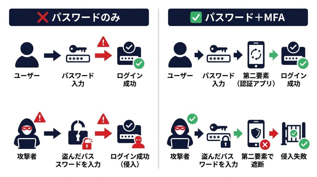 MFAが有効な理由は、要素をまたいだ攻撃が難しいからです。パスワードを盗んでも、認証アプリが入ったスマートフォンを奪わなければログインできない——この「2つの壁」が攻撃者にとって大きな障壁になります。